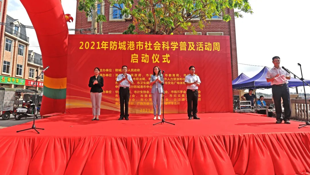 2021年5月17日,防城港市2021年社會科學(xué)普及周活動啟動儀式在港口區(qū)企沙鎮(zhèn)朝陽路三角塘廣場順利開幕!防城港市人民政府副市長于華等領(lǐng)導(dǎo)出席了啟動儀式,并向華僑學(xué)校等有關(guān)單位、學(xué)校、群眾代表贈送科普書籍。廣西華業(yè)投資集團(tuán)有限公司社會科學(xué)界聯(lián)合會(簡稱“華業(yè)社科聯(lián)”)等近20家會員單位踴躍參加了啟動儀式及普及周活動。