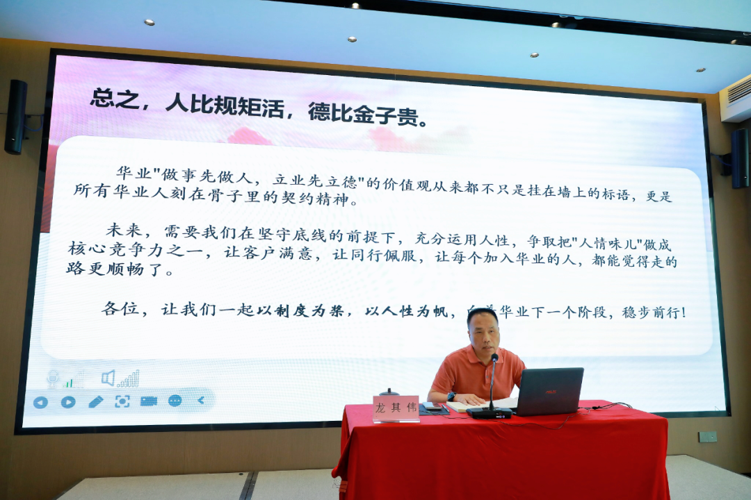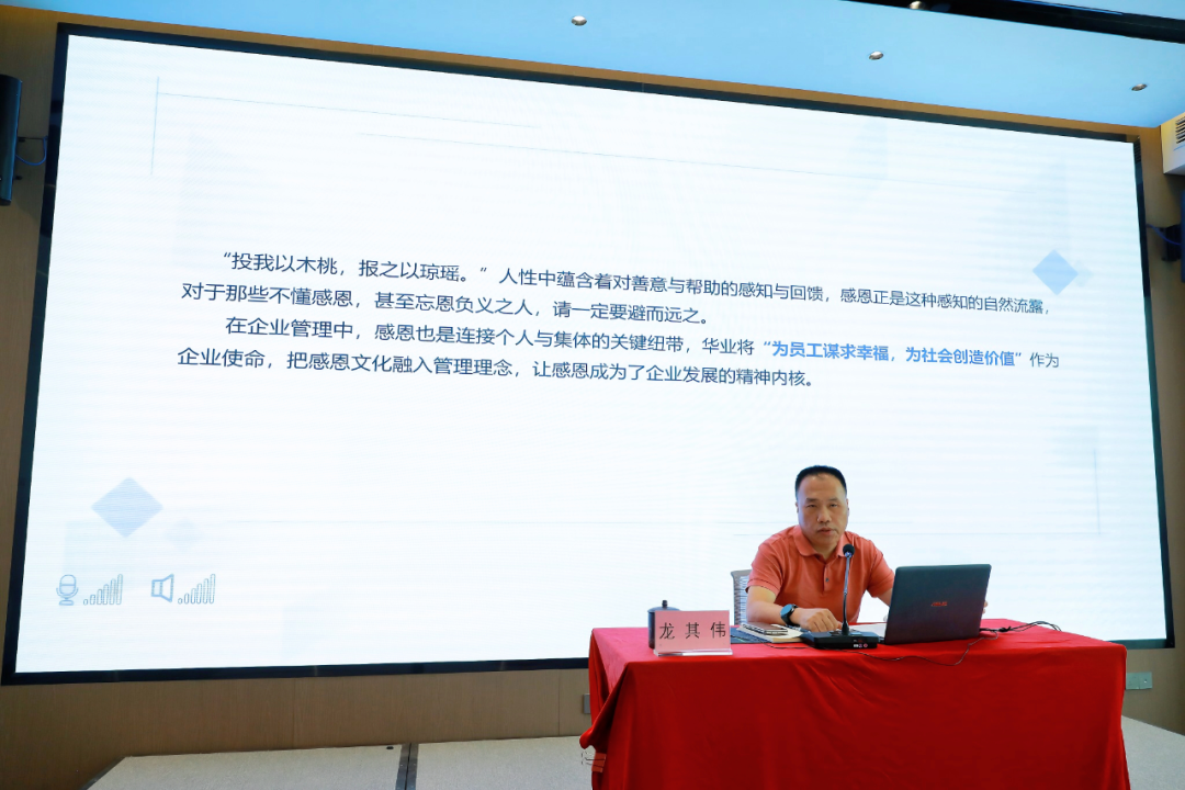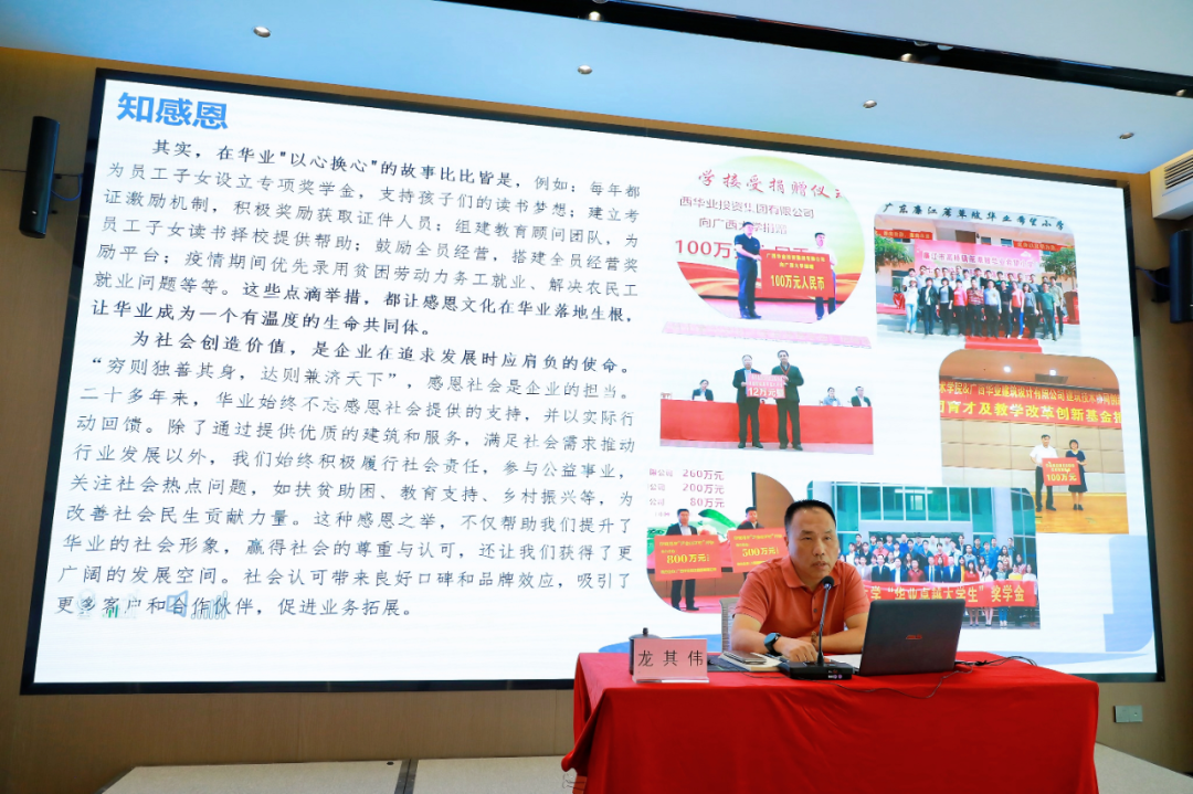 在“人性與企業(yè)管理的融合”篇章,龍其偉總裁強(qiáng)調(diào)企業(yè)管理歸根結(jié)底是對(duì)“人”的管理。他結(jié)合集團(tuán)實(shí)際,與大家分享華業(yè)如何通過(guò)“守信用、講道德、知感恩、重團(tuán)結(jié)”四大基石構(gòu)建具有華業(yè)特色的人性化管理體系。